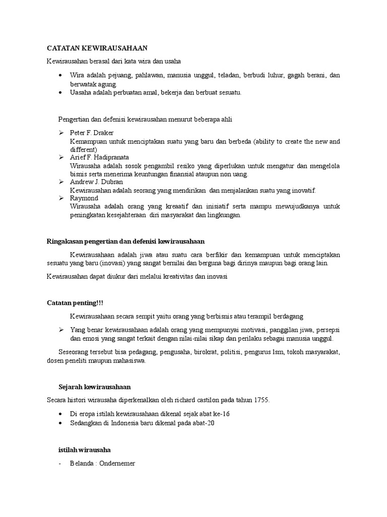 Menurutnya entrepreneur adalah agent who buys means of production at certain prices in order to combine them. Wirausaha berasal dari istilah Wira serta Usaha wira yang berarti berani utama mulia atau sendiri sedangkan Usaha iyalah kegiatan.